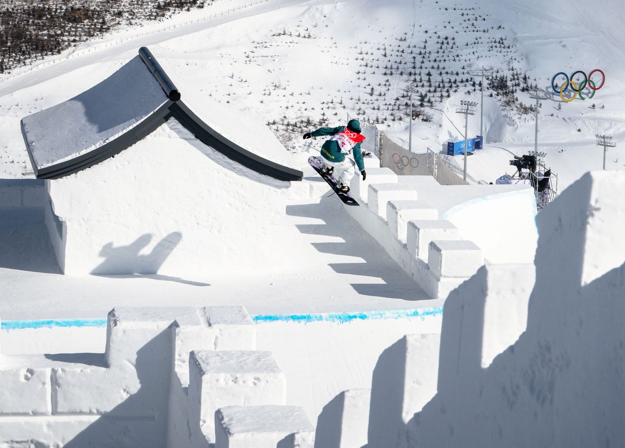 2月4日,北京冬奥会单板滑雪项目坡面障碍技巧的运动员在崇礼云顶滑雪公园进行训练。新华社记者肖艺九摄