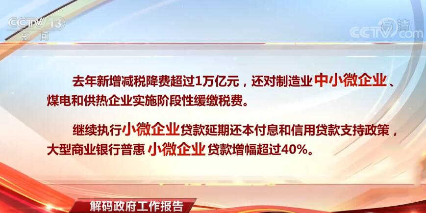 我们选择了几条来看看,在2021年工作回顾中报告就提及,去年新增减税降费超过1万亿元,对制造业中小微企业、煤电和供热企业实施阶段性缓缴税费。继续执行小微企业贷款延期还本付息和信用贷款支持政策,大型商业银行普惠小微企业贷款增幅超过40%。在2022年政府工作任务中提到,延续实施扶持制造业、小微企业和个体工商户的减税降费政策。优先安排小微企业,对小微企业的存量留抵税额于6月底前一次性全部退还。加大研发费用加计扣除政策实施力度,将科技型中小企业加计扣除比例从75%提高到100%。着力培育“专精特新”企业,在资金、人才、孵化平台搭建等方面给予大力支持。扩大出口信用保险对中小微外贸企业的覆盖面等等。
