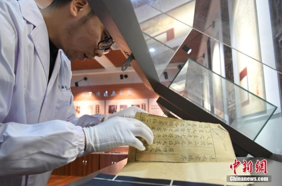 安徽中医药大学的古籍部,距今已超过400多年的珍贵古籍《 赤水玄珠》放在特制的柜子中存放。一本医学类古书籍经过拆书、清理到修补,再到压平、装帧,最后通过数字化扫描,建立古籍修复档案等多道步骤完成修复,传统手艺与科技的“相逢”,让珍贵古籍“迎新生”。 中新社记者 韩苏原 摄