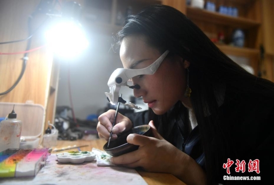 94年出生的唐洁在自己创办的文物修复工作室忙碌着:先是要找到同时期的瓷片,将其磨成粉再配型。之后是上釉,拿着高倍放大镜,一个点放大出来的无数带有色阶变化的马赛克,一点点涂釉色,经过阴干,确认落笔无误后,再上釉阴干,反反复复,直到完全还原。吕明 摄