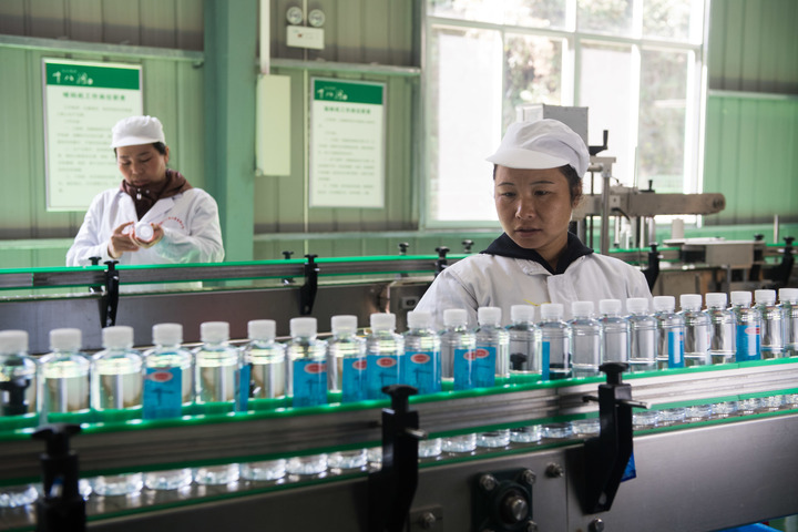 2019年10月29日,在湘西土家族苗族自治州花垣县十八洞村山泉水厂,村民在流水线上工作。新华社记者 陈思汗 摄
