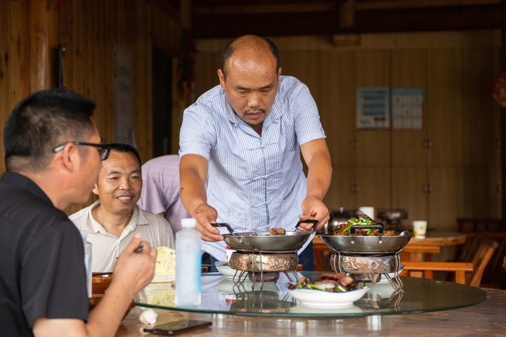 2021年6月30日,在湘西土家族苗族自治州花垣县十八洞村,村民在自家开的饭店招呼客人。新华社记者 陈思汗 摄