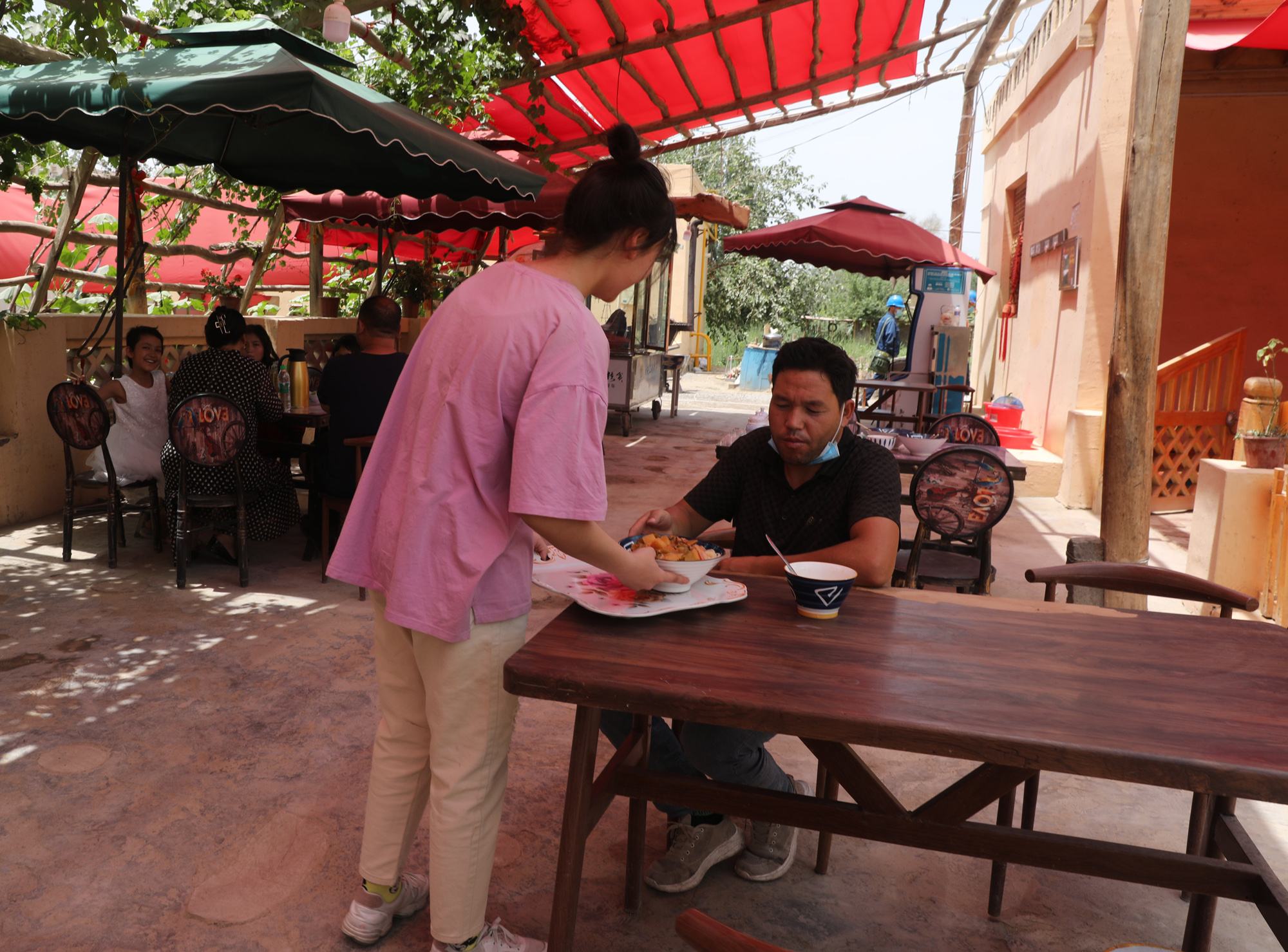 托万特根拉村第一书记阿卜杜如斯力·图尔荪介绍,实现脱贫后,现在村里水、电、路、气、通信、安居房甚至下水管网一应俱全,搞乡村旅游的硬件条件都具备了。2020年村里只有7家商户,去年村里开始发展旅游后,服装店、餐馆、美容店、农家乐、采摘园等已有52家商户,30%还是吸引外地人来开的。
