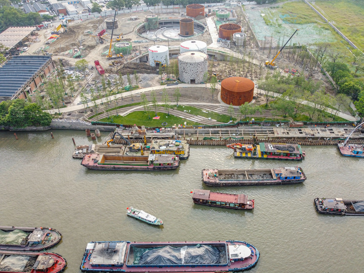 这是5月27日在浙江省杭州市拍摄的建设中的小河公园,该公园由一处工业遗存小河油库改造而成(无人机照片)。新华社记者 江汉 摄