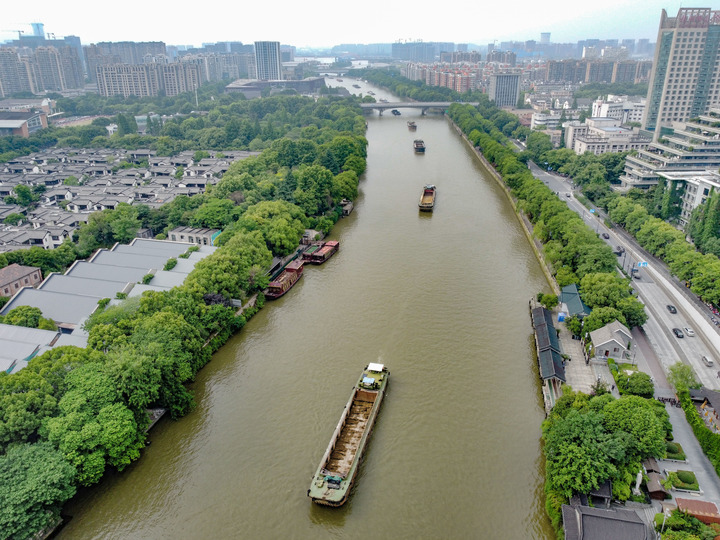 这是5月27日拍摄的行驶在大运河杭州段的货船(无人机照片)。新华社记者 江汉 摄