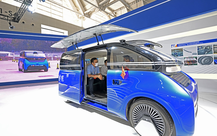 6月24日,在第六届世界智能大会天津制造业立市展上,参会嘉宾体验“天津号”纯太阳能汽车。新华社记者 赵子硕 摄