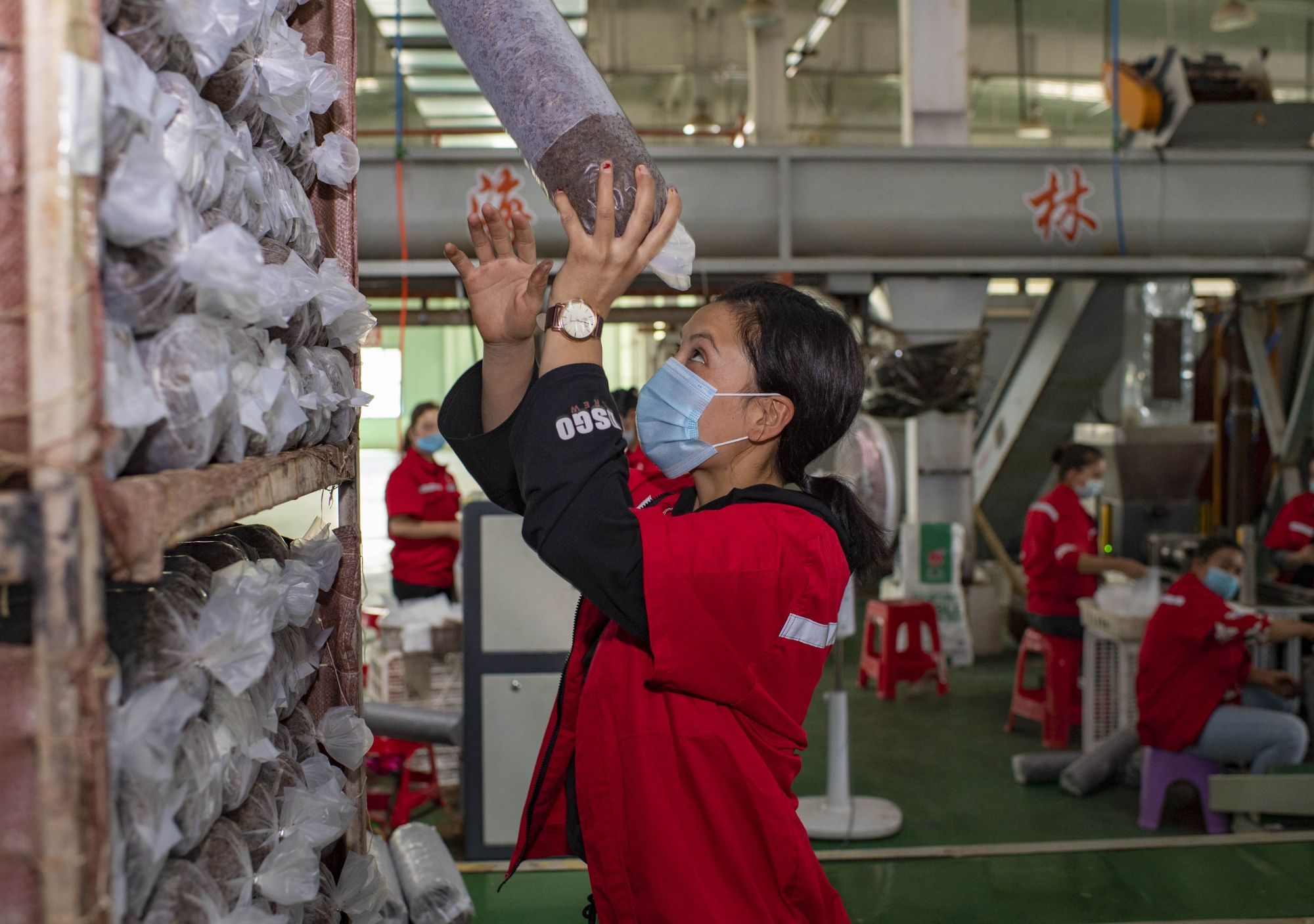 新疆墨玉县萨依巴格乡村民阿孜古丽·阿卜力提甫在当地一家菌业公司的菌种装袋车间工作(2020年9月22日摄)。新华社记者 胡虎虎 摄