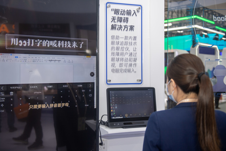 在腾讯公司展区,一款可以用眼睛打字的眼动输入仪吸引了人们的关注。仪器能够精准捕捉用户的眼球滚动,从而实现打字功能。展会工作人员介绍,对于残障人士、“渐冻症”患者等人群来说,通过眼球转动和凝视即可操作电脑完成输入,眼动输入仪帮助他们提升了打字效率,使他们的生活更加便利。