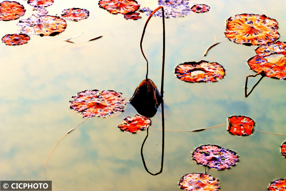 ↑11月5日在江西省南昌市南昌植物园内拍摄的荷叶。CICPHOTO/袁骏 摄