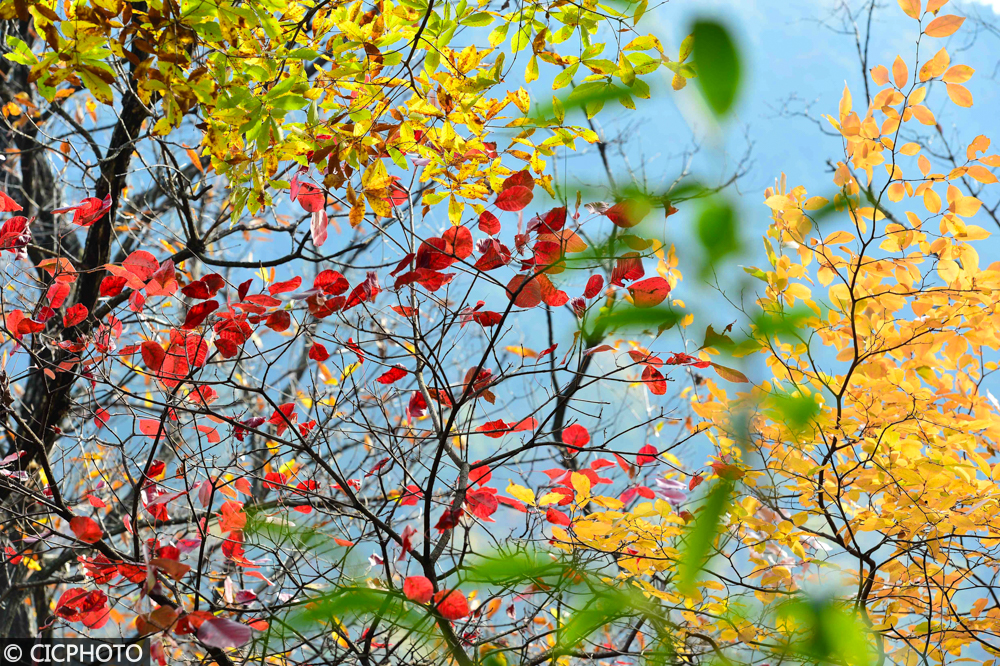↑11月5日在湖北省襄阳市保康县歇马镇九路寨景区拍摄的五彩秋叶。CICPHOTO/杨韬 摄