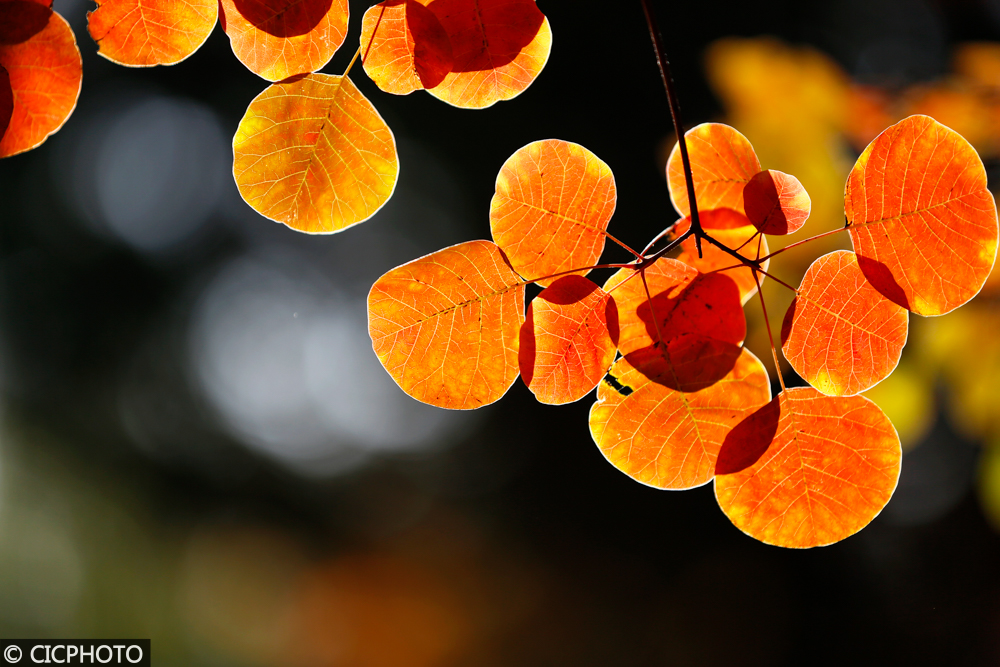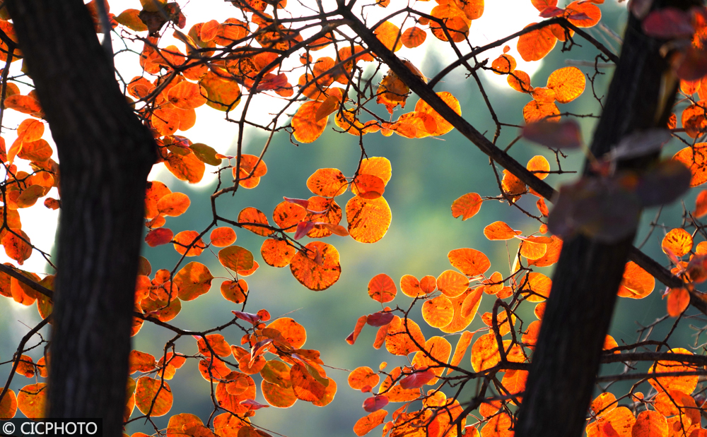 ↑10月16日在山西省临汾市襄汾县东岭森林公园内拍摄的黄栌叶。CICPHOTO/李现俊 摄