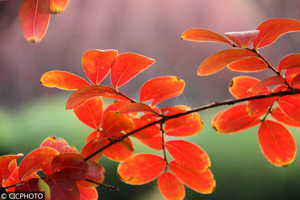 ↑10月23日在山东省威海市威海公园里拍摄的紫薇树叶。CICPHOTO/宋永强 摄