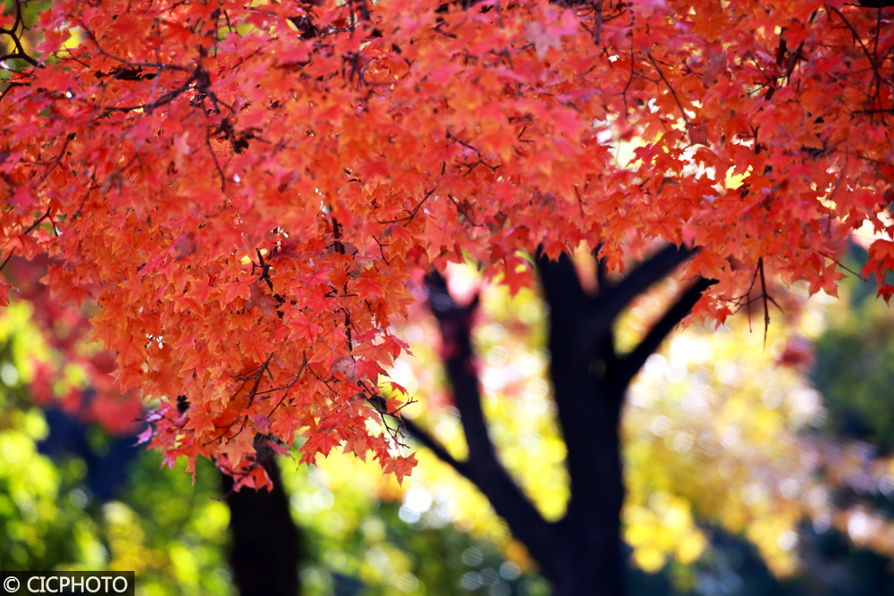 ↑10月18日在辽宁省沈阳市北陵公园内拍摄的枫叶。CICPHOTO/黄金崑 摄