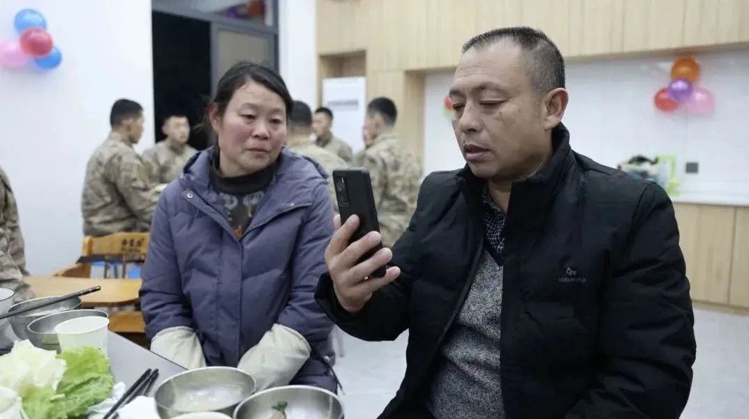 父母带着肖思远的照片,来到小儿子连队过年。