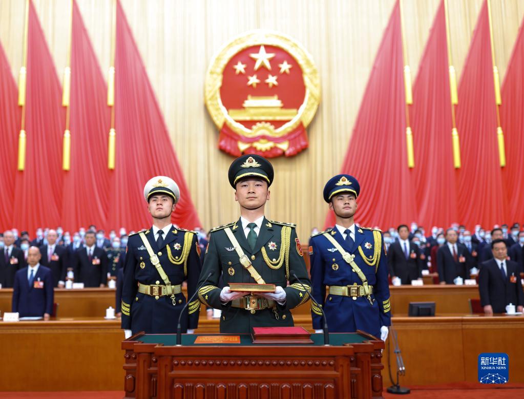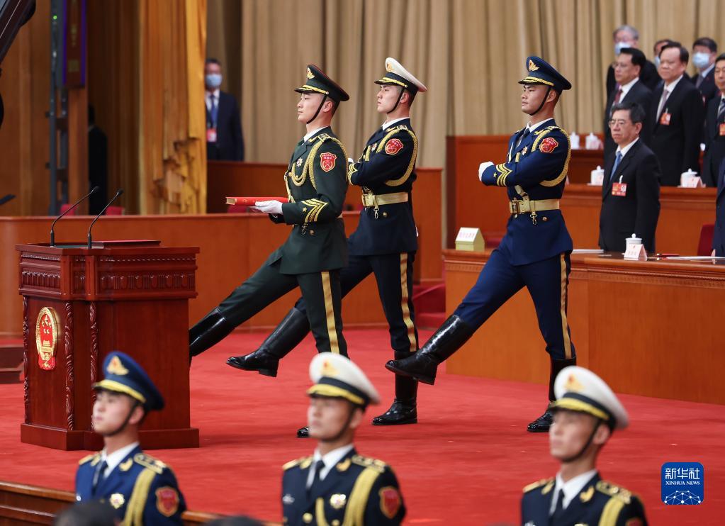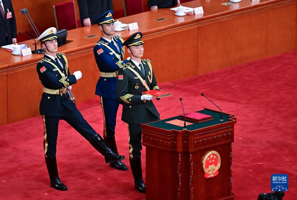 3月10日,中华人民共和国第十四届全国人民代表大会第一次会议宪法宣誓仪式在北京人民大会堂举行。主席台上,3名礼兵迈着正步护送《中华人民共和国宪法》入场。