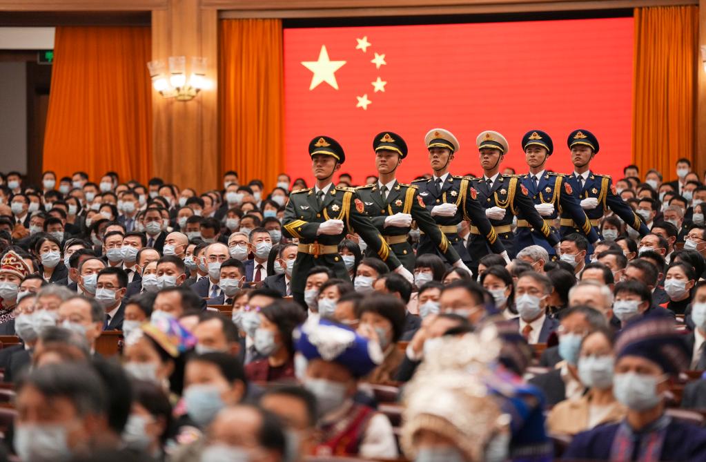 3月10日,中华人民共和国第十四届全国人民代表大会第一次会议宪法宣誓仪式在北京人民大会堂举行。主席台上,3名礼兵护送《中华人民共和国宪法》入场。