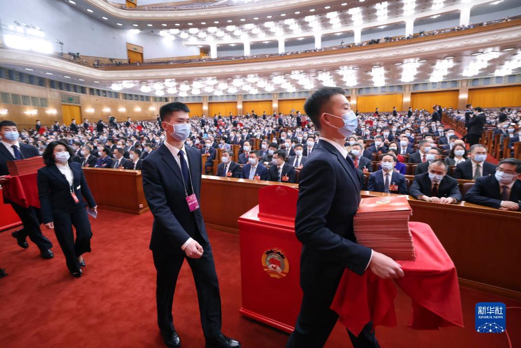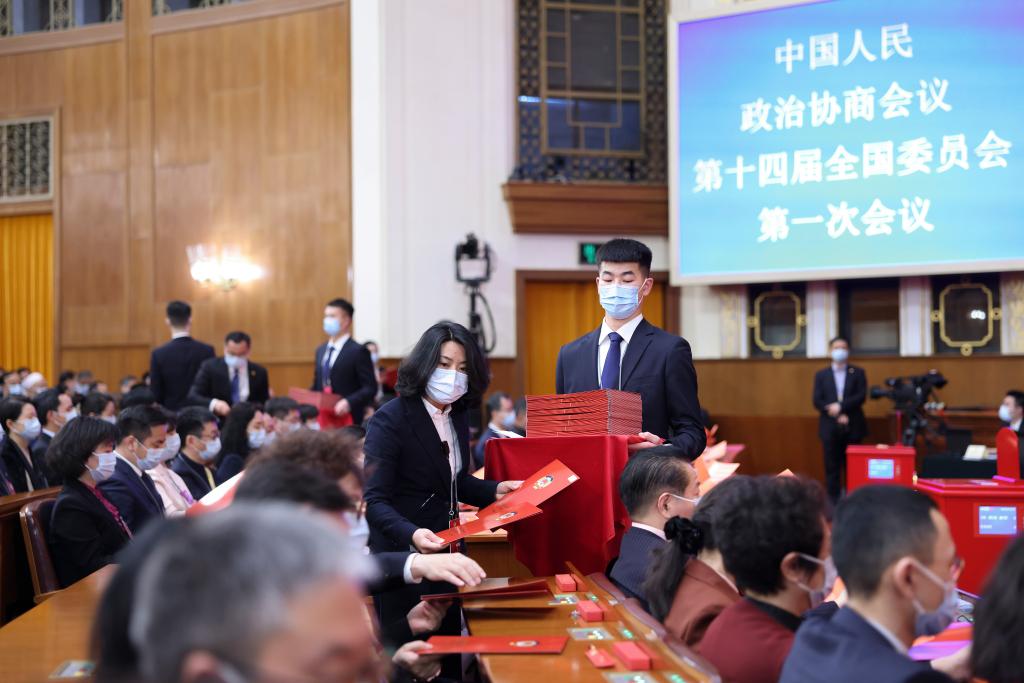 3月10日,全国政协十四届一次会议在北京人民大会堂举行第三次全体会议。这是工作人员发放选票。
