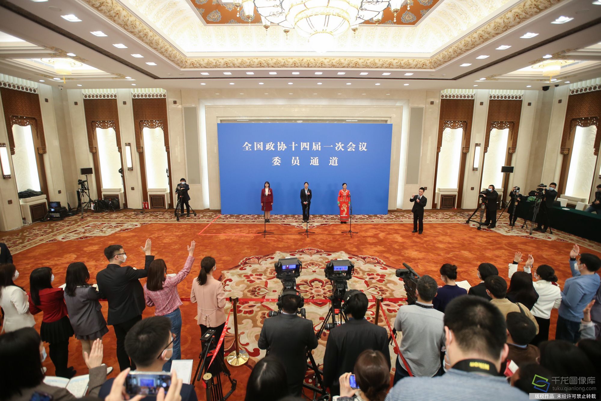 全国政协十四届一次会议第三场“委员通道”集体采访活动现场。千龙网记者 陈健男摄