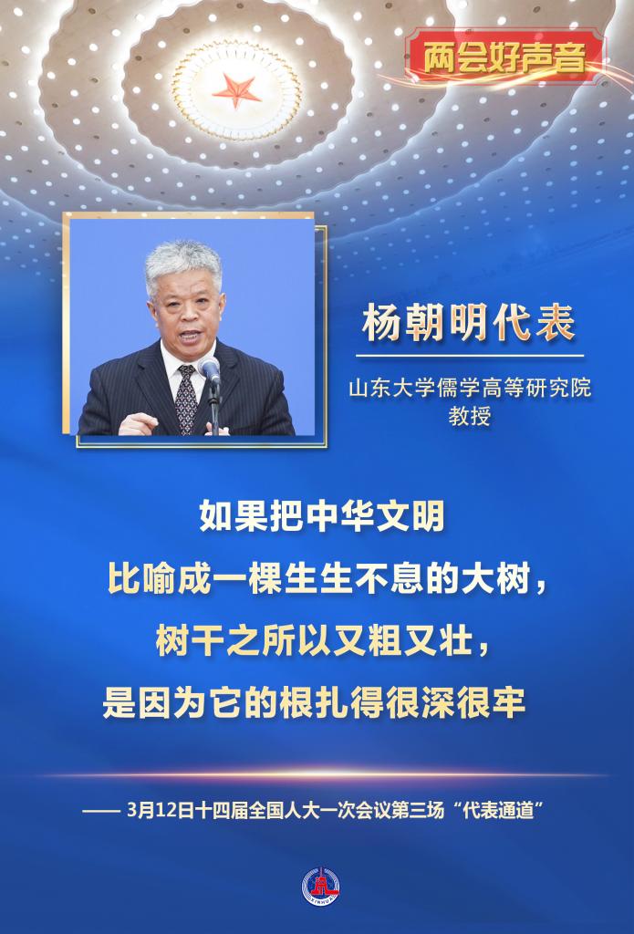 “作为来自文化战线的代表,要更好地履职尽责,通过研究工作,为更好地弘扬中华优秀传统文化,增强文化自信,加强文明交流互鉴,建设社会主义文化强国,发挥自己的一份光和热。”杨朝明说。