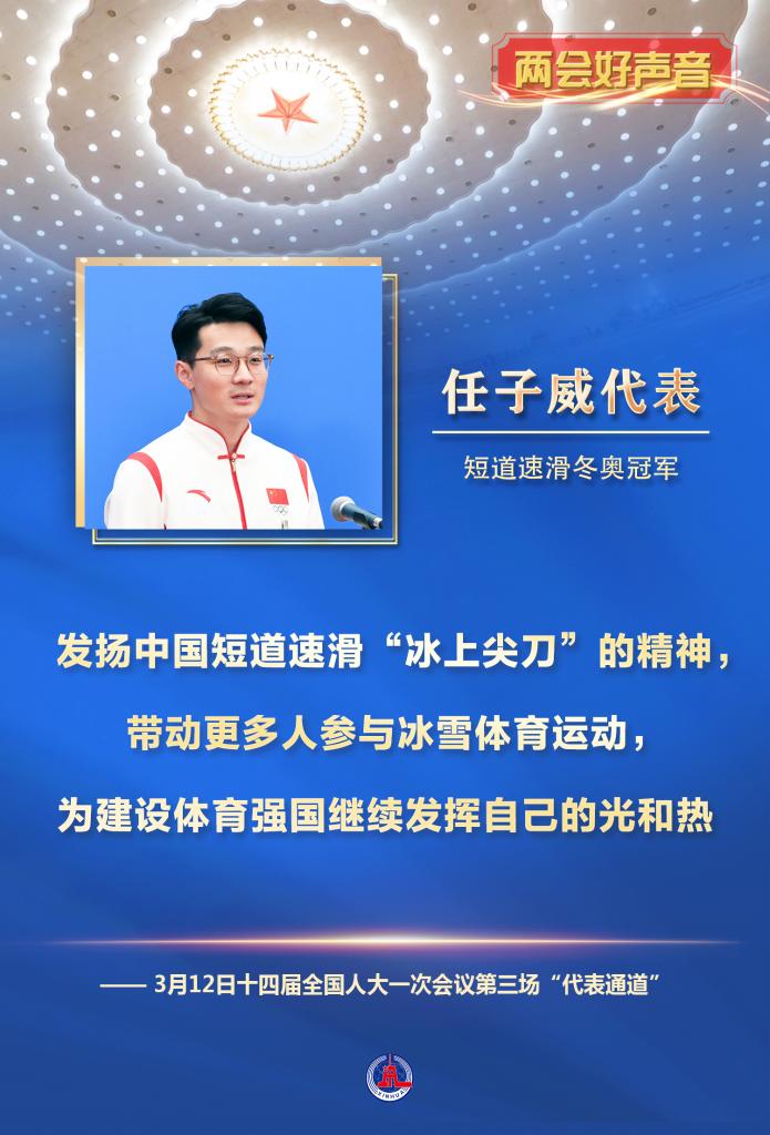 全国人大代表、短道速滑冬奥冠军任子威说,将继续为国出征,发扬中国短道速滑‘冰上尖刀’的精神,带动更多人参与冰雪体育运动,为建设体育强国继续发挥自己的光和热。