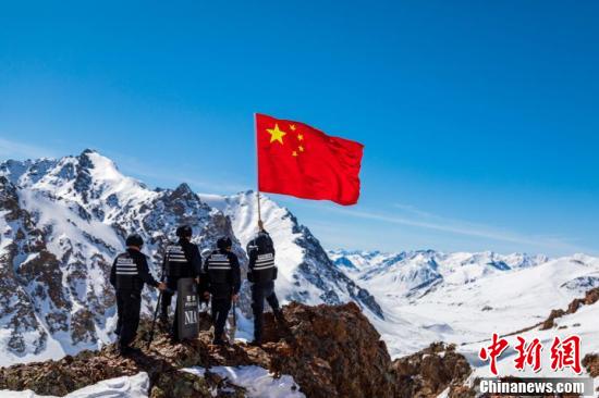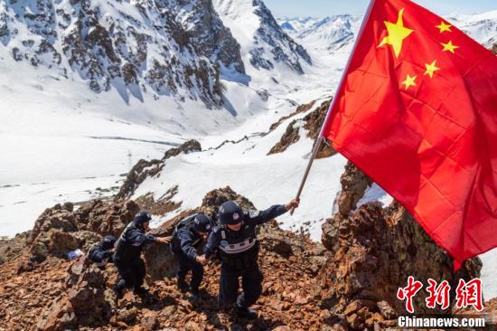 4月9日,新疆博州边境管理支队温泉边境管理大队安格里格边境派出所民警以徒步的方式,在博州海拔3600米的莫斯吾冰达坂上开展巡逻踏查,确保边境地区安全稳定。图为移民管理警察相互搀扶攀登上海拔3600米的冰达坂。