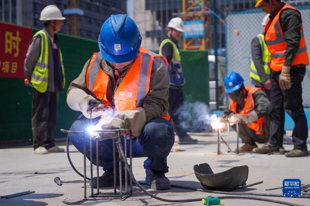 4月27日,在江苏南京华贸项目施工现场,建设者代表在中建三局浙江公司组织的“技能大比武”活动中参加钢筋焊接比赛。