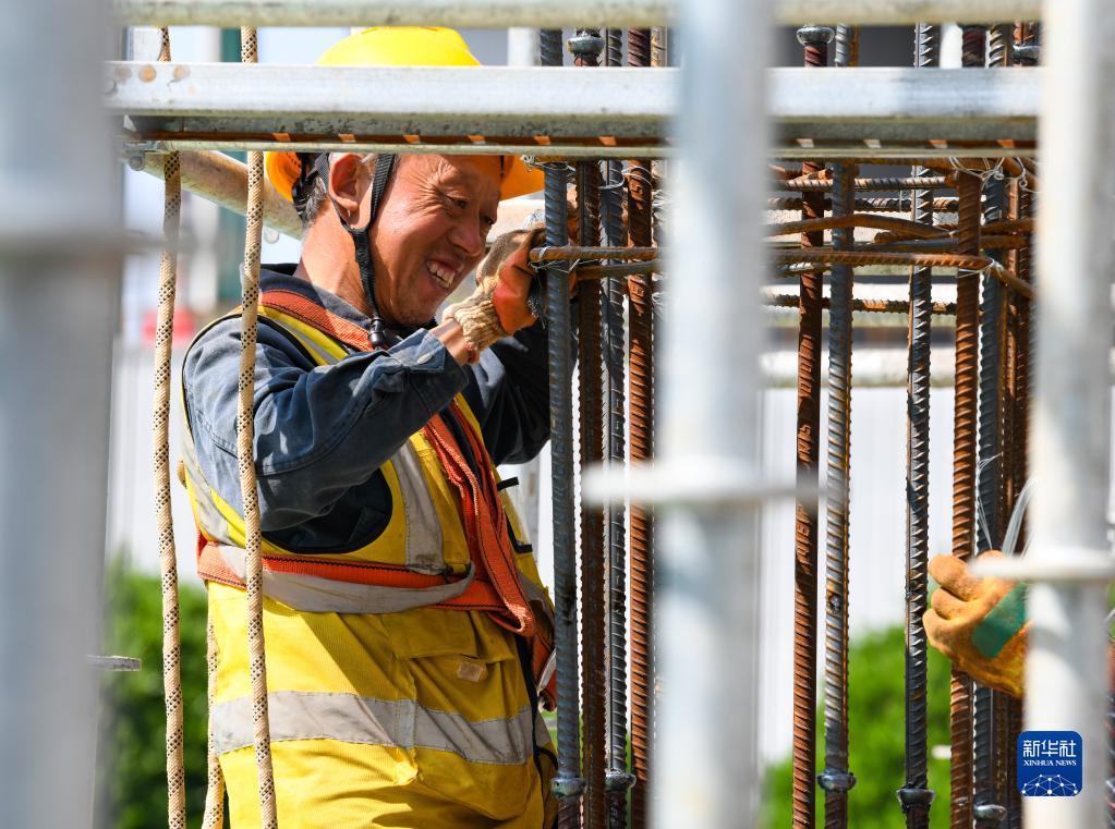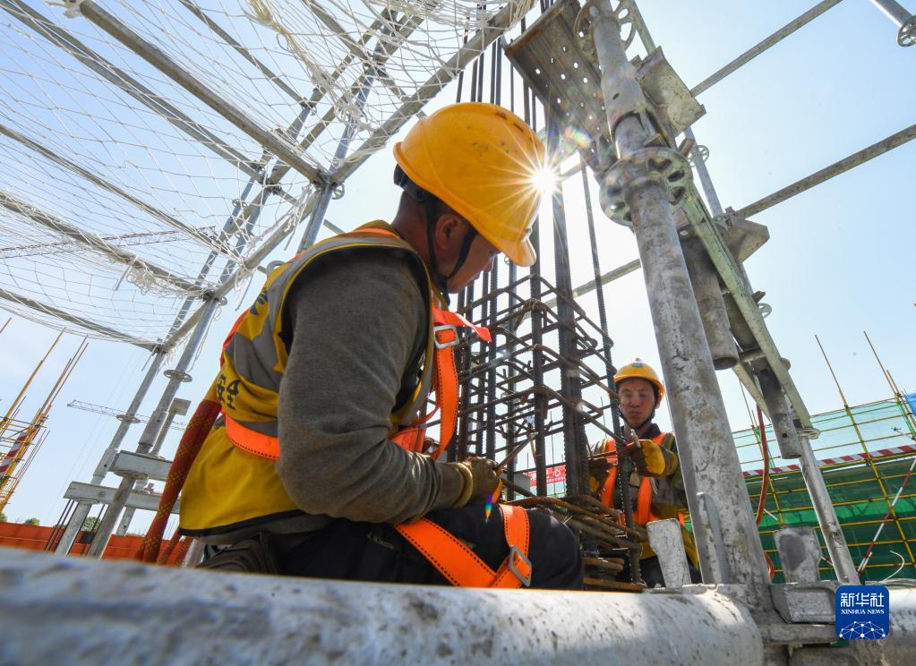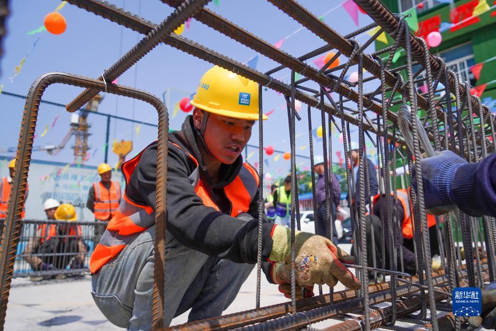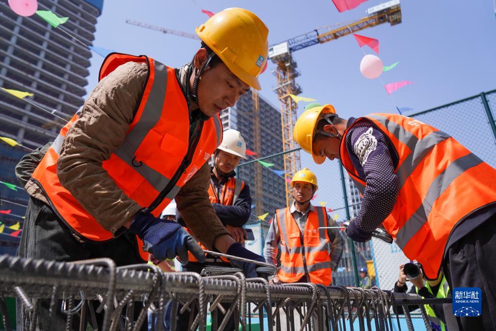 4月27日,在江苏南京华贸项目施工现场,建设者代表在中建三局浙江公司组织的“技能大比武”活动中参加钢筋绑扎比赛。