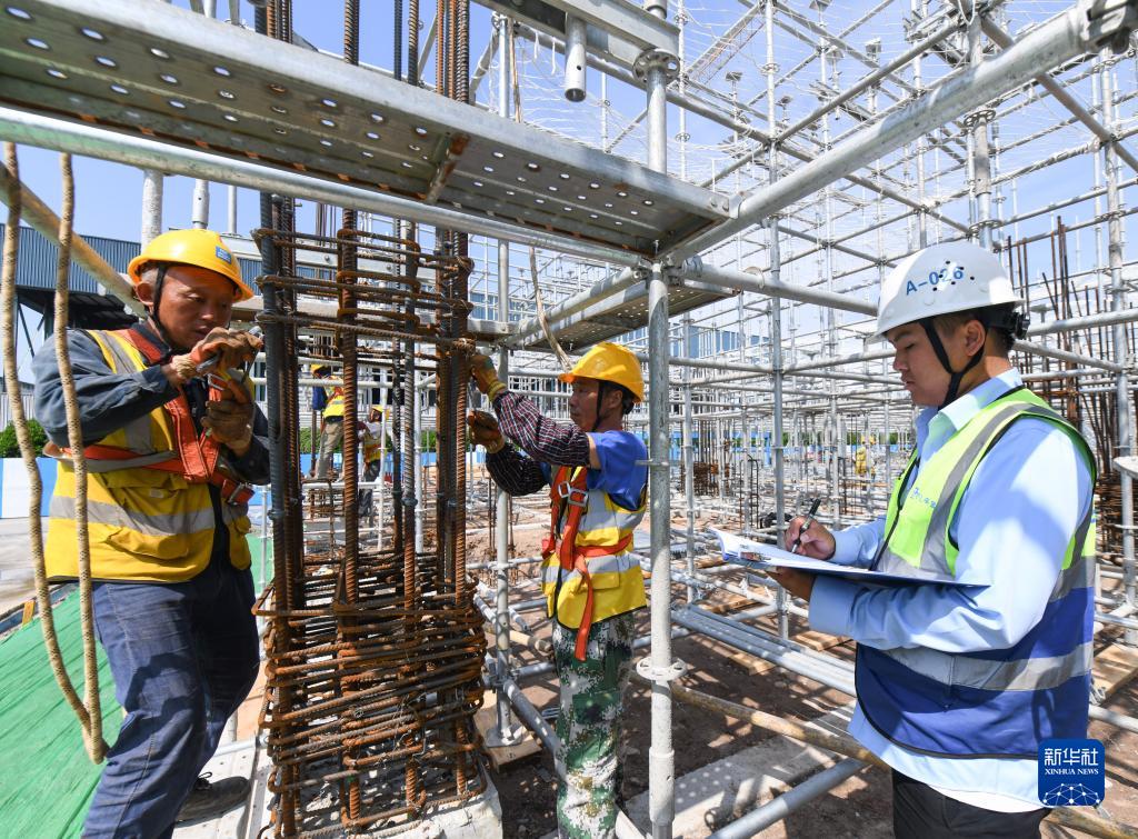 4月27日,在中建安装集团有限公司位于四川遂宁市射洪市的厂房增产扩能项目建设现场,记分员(右)在柱钢筋绑扎比赛项目中打分。