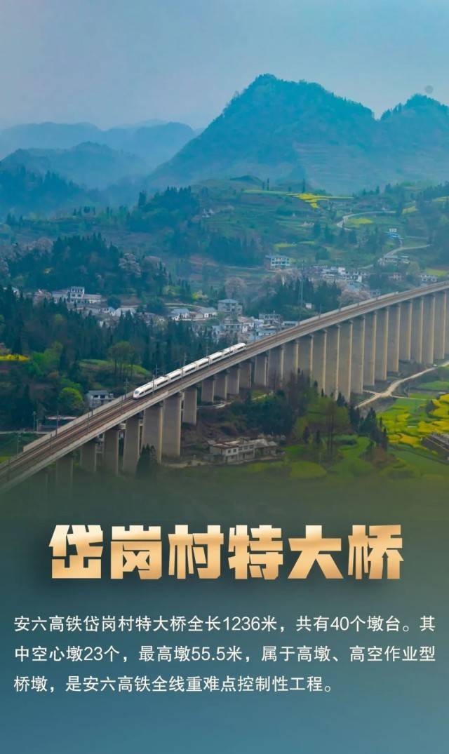 安六高铁运营里程约125公里,桥隧总长89公里,桥隧比达74.2%。线路沿线为喀斯特地貌,地质变化频繁,岱岗村特大桥、黄桶北2号特大桥、龙潭大桥是其桥梁代表。