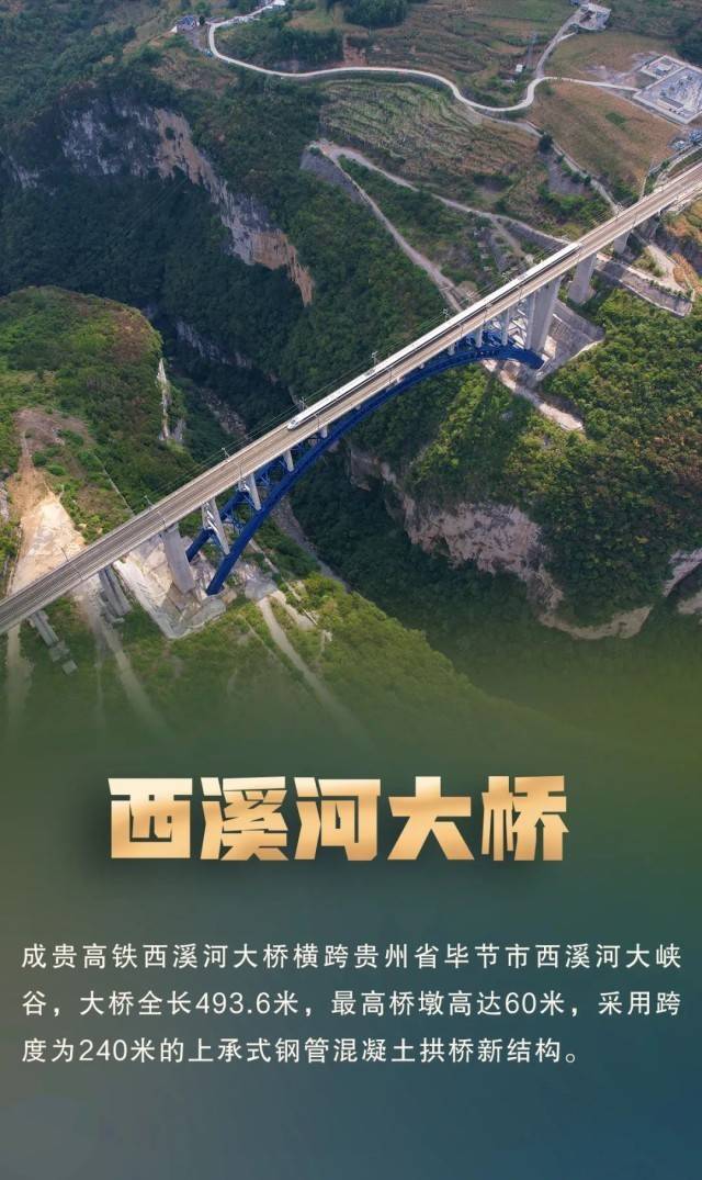 成贵高铁全长约632.6公里,是国家实施新一轮西部大开发的标志性工程之一。成贵高铁全线有隧道183座,桥梁365座,其中具有代表性的大桥有鸭池河特大桥、西溪河大桥等。