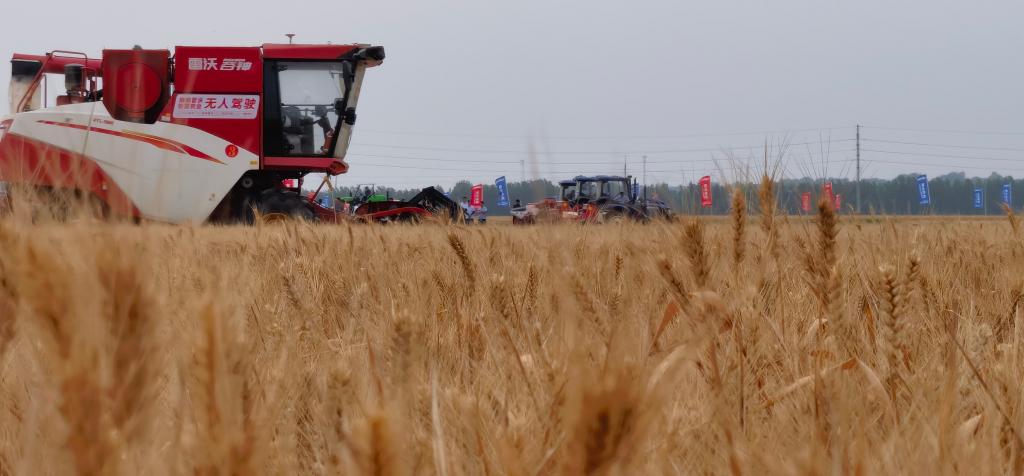 2023年中国农机推广“田间日”活动现场,无人驾驶收割机正在收割小麦。新华社记者 叶婧 摄