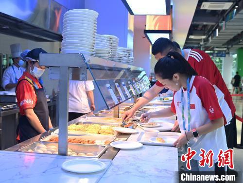 7月26日,运动员在餐厅选取菜品。 中新社记者 安源 摄