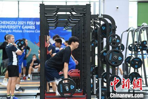7月27日,成都第31届世界大学生夏季运动会运动员村,参赛运动员在健身房进行赛前训练。 中新社记者 陈超 摄