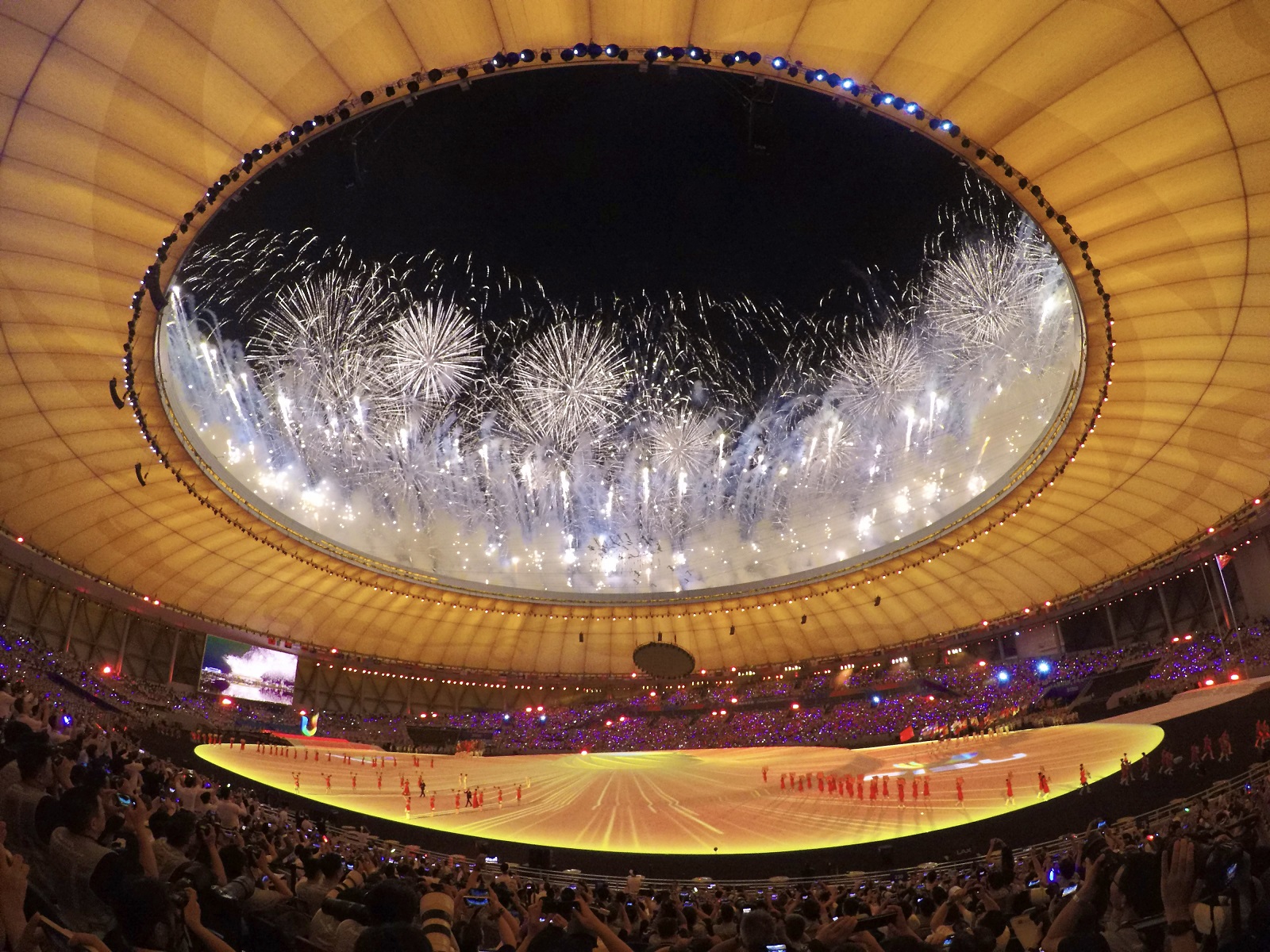 东安湖畔,放大了270万倍的“太阳神鸟”在夜幕下熠熠生辉,这里是成都。在“太阳神鸟”圆形穹顶下,第三十一届世界大学生夏季运动会开幕式精彩绽放。
