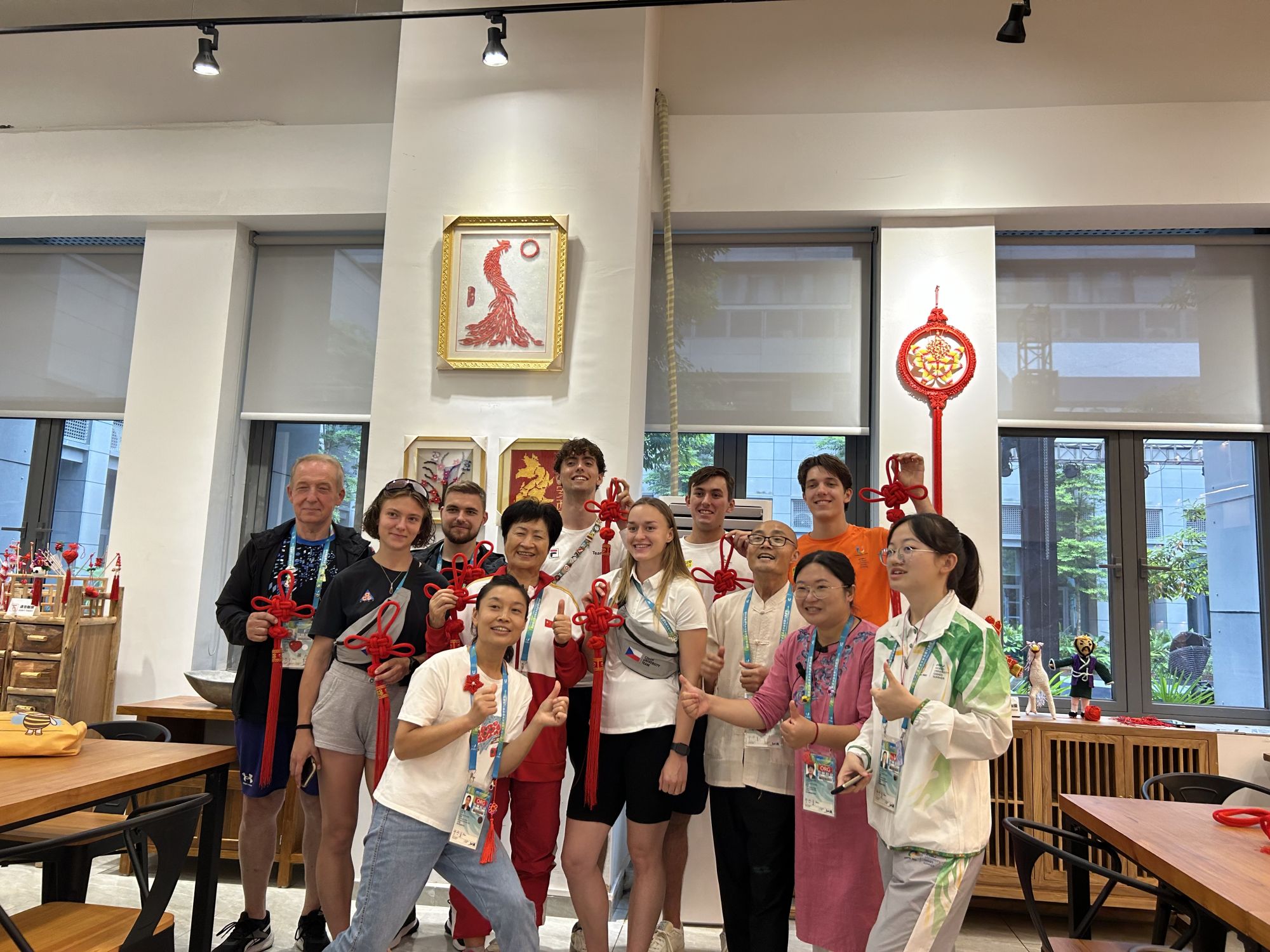 “今天和朋友一起过来体验了中国传统文化,这是一个非常有趣的体验,虽然我并不擅长绳编,感谢老师们帮助我顺利完成。”在大运村互动体验中心绳编区域,来自荷兰的击剑运动员佐恩斯和朋友在指导老师的指导下,顺利完成自己的作品。当了解到绳编“吉祥如意”的美好寓意后,他希望把自己的作品送给家人。
