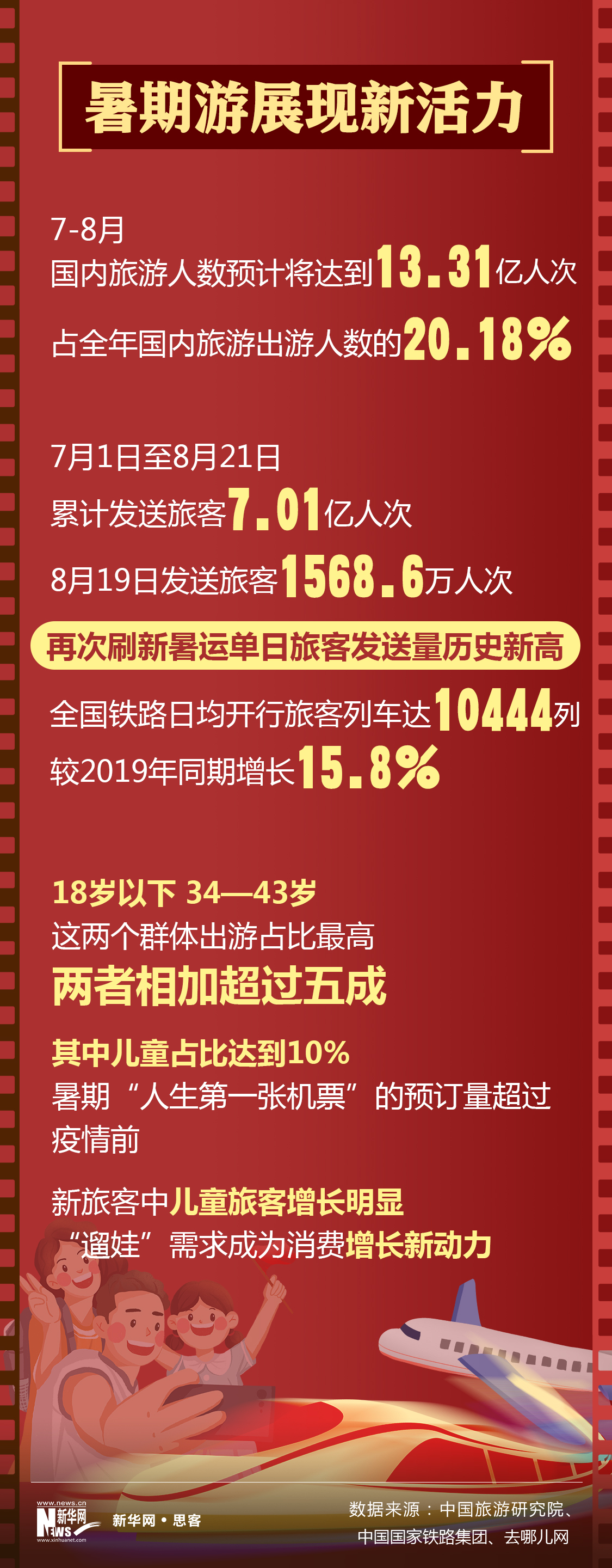 2023年暑期旅游市场热度预计全面超过2019年同期。根据中国旅游研究院预测,在大中小学生放假最为集中的7—8月,国内旅游人数预计将达到13.31亿人次,占全年国内旅游出游人数的20.18%。