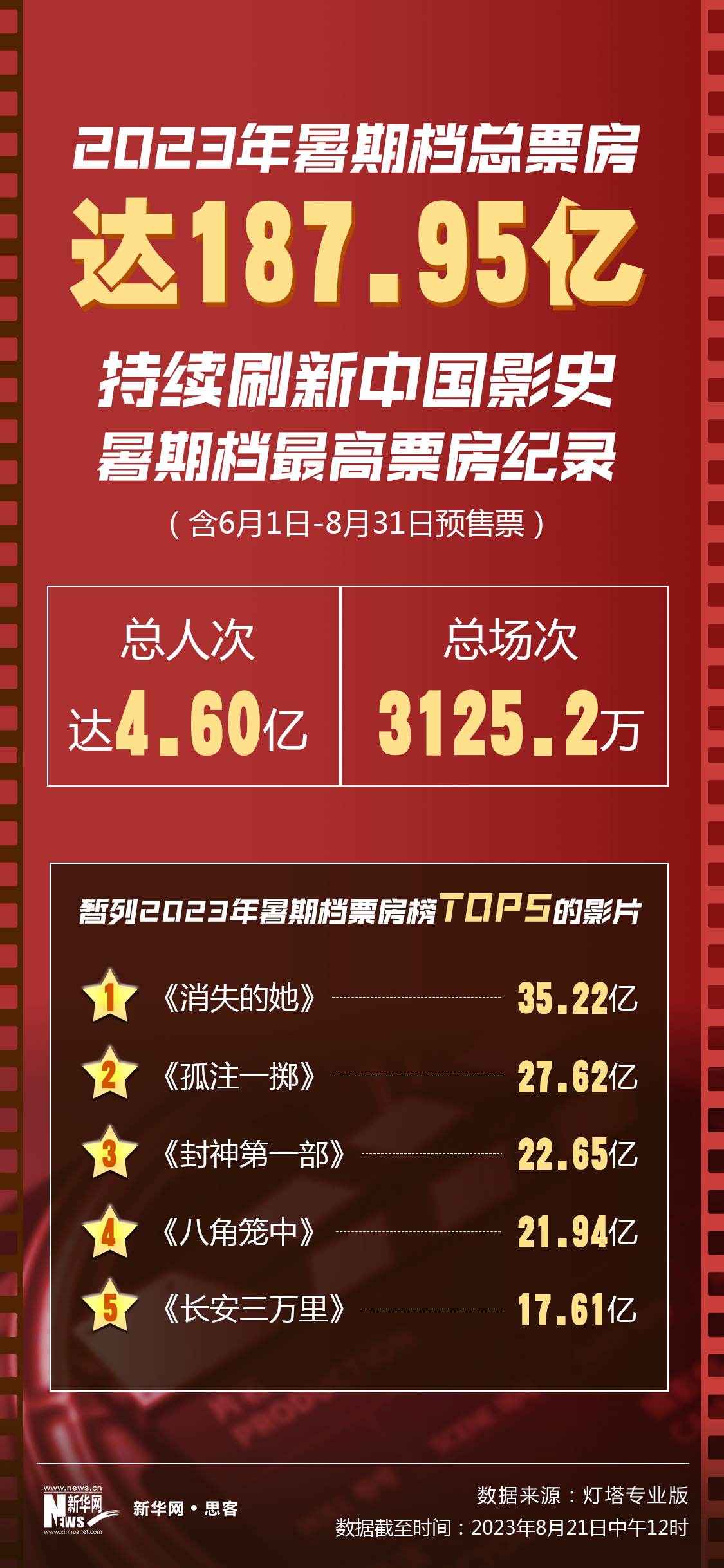 暑期档通常是全年电影市场最丰富的档期之一。据灯塔专业版数据显示,截至8月21日中午12时,2023年暑期档总票房达187.95亿,持续刷新中国影史暑期档最高票房纪录,总人次达4.60亿,总场次3125.2万。电影市场热度持续狂飙。