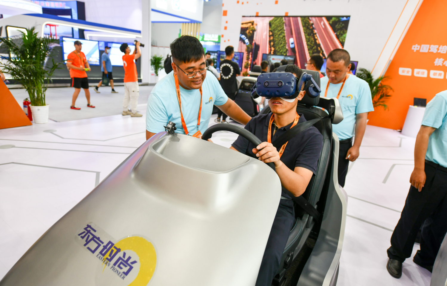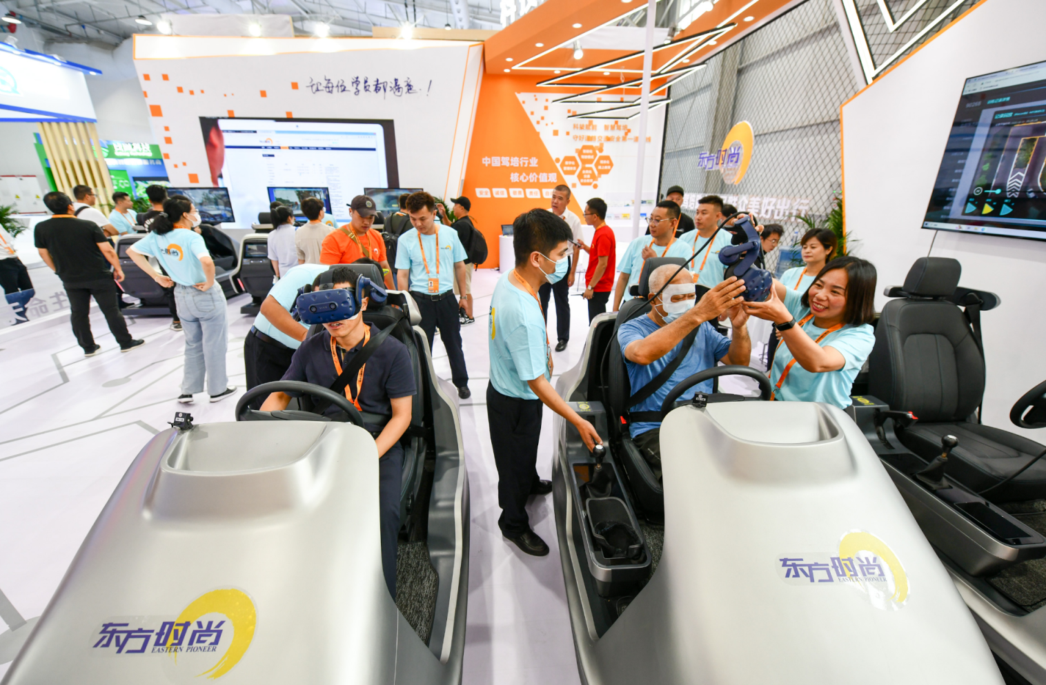 上午,记者在现场看到,智慧驾培试驾区人气颇高,多个模拟驾驶舱旁,观众排起队来。“啊!我不小心撞到人了。”一位观众惊呼着松开方向盘。通过驾驶舱方向盘上方的大屏幕,用户可以自由选择模拟场景,比如,自由驾驶模块,提供城市、高速、乡村、山区等多场景选择,进入山区场景,还可以进一步选择夜间、雨天、雾天、雪天等天气环境。