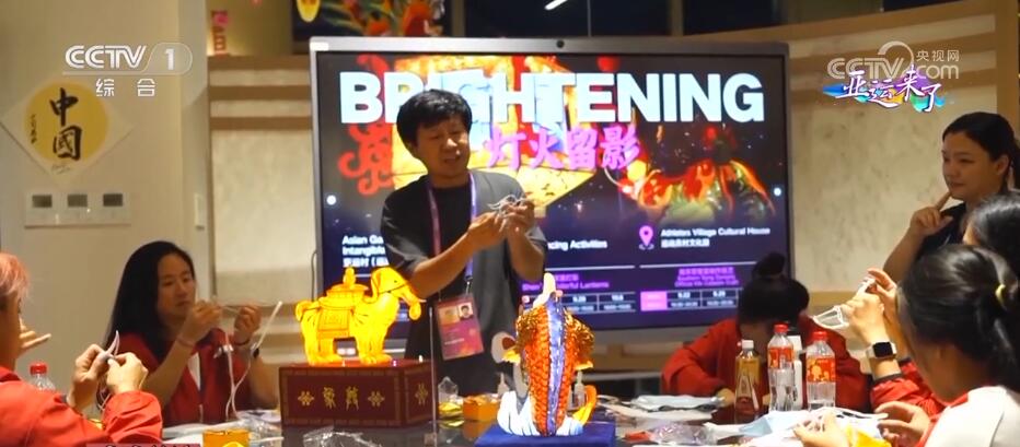 在运动员村的文化小屋内,各式各样的非遗动态展示和体验活动吸引了不少运动员前来参观。浙江省级非遗深澳灯彩手工艺课程吸引了很多运动员来体验。从糊灯笼到贴纹饰,再到穿灯绳,每个人一丝不苟。