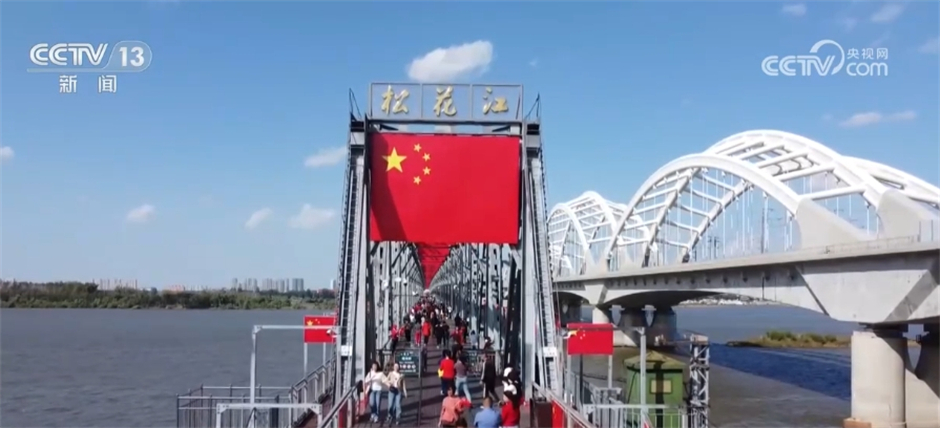 假日期间,拥有一百多年历史的松花江滨洲铁路桥,在800面五星红旗的装饰下成了众多市民游客抒发爱国情怀的“祝愿桥”。