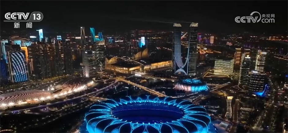杭州奥体中心体育场“大莲花”在灯光的映衬下显得格外璀璨,成片的光柱在夜空中舞动,它们时而绚烂多姿,时而直冲云霄,让在场的观众发出一阵阵惊呼。