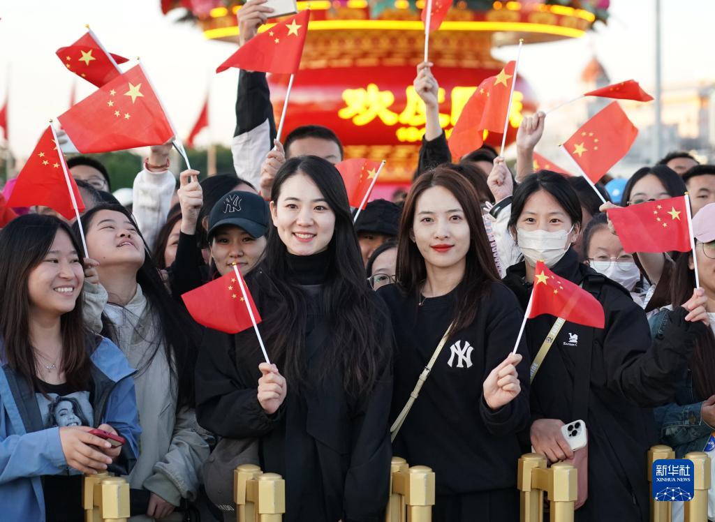 10月1日,在观看升旗仪式后,人们在北京天安门广场留影。新华社记者 张晨霖 摄