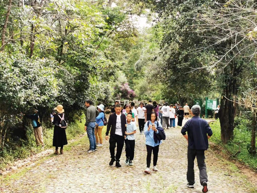 10月1日上午,景迈山大平掌古茶林里,游客们漫步在古茶林间,呼吸着清新的空气。
