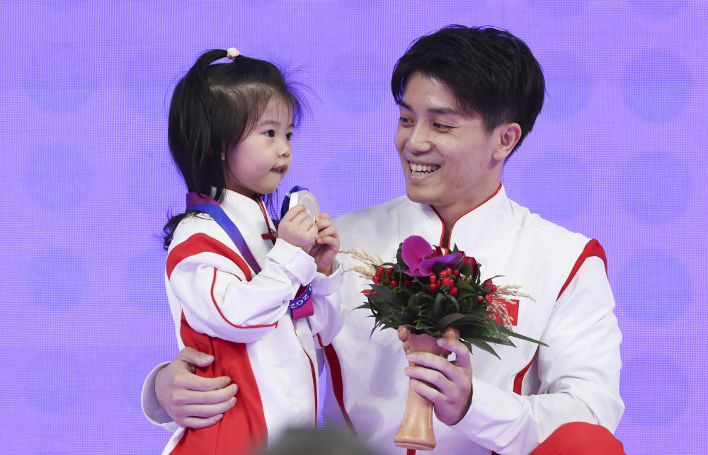 9月29日,中国选手林超攀在杭州亚运会竞技体操项目男子单杠比赛颁奖仪式后与女儿庆祝。新华社记者 程婷婷 摄