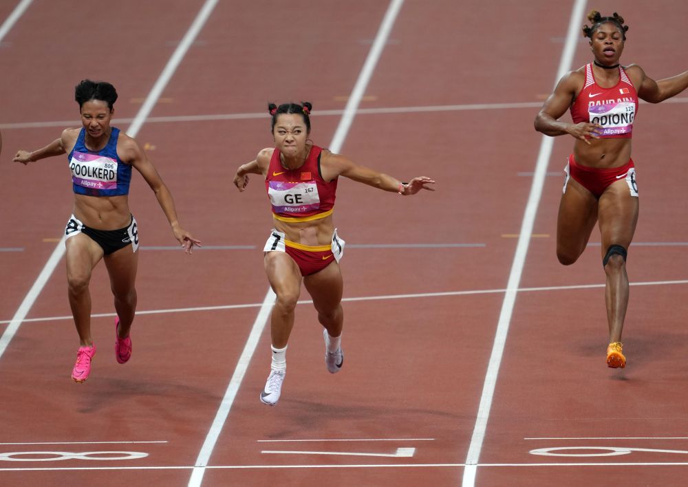 9月30日,中国选手葛曼棋(中)在杭州亚运会田径项目女子100米决赛中冲线。新华社记者 江文耀 摄