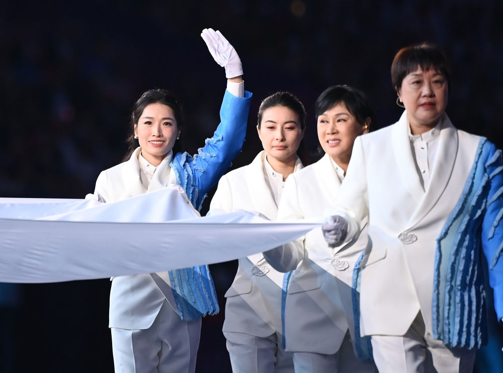 9月23日,亚奥理事会会旗旗手罗雪娟(左一)在杭州亚运会开幕式上执旗入场。新华社记者 江汉 摄