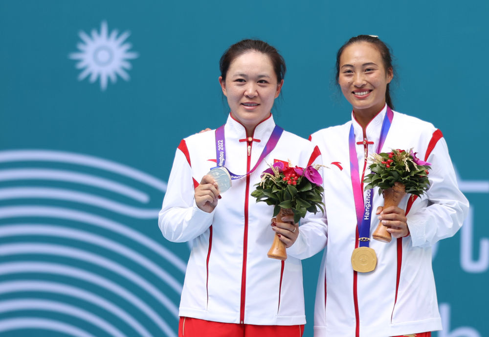 9月29日,冠军中国选手郑钦文(右)与亚军朱琳在杭州亚运会网球项目女子单打比赛颁奖仪式上合影。新华社记者 贾浩成 摄