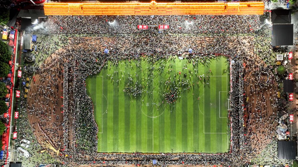 7月29日,贵州榕江(三宝侗寨)和美乡村足球超级联赛迎来年度总决赛。这是观众在比赛结束后涌入赛场(无人机照片)。新华社记者 欧东衢 摄