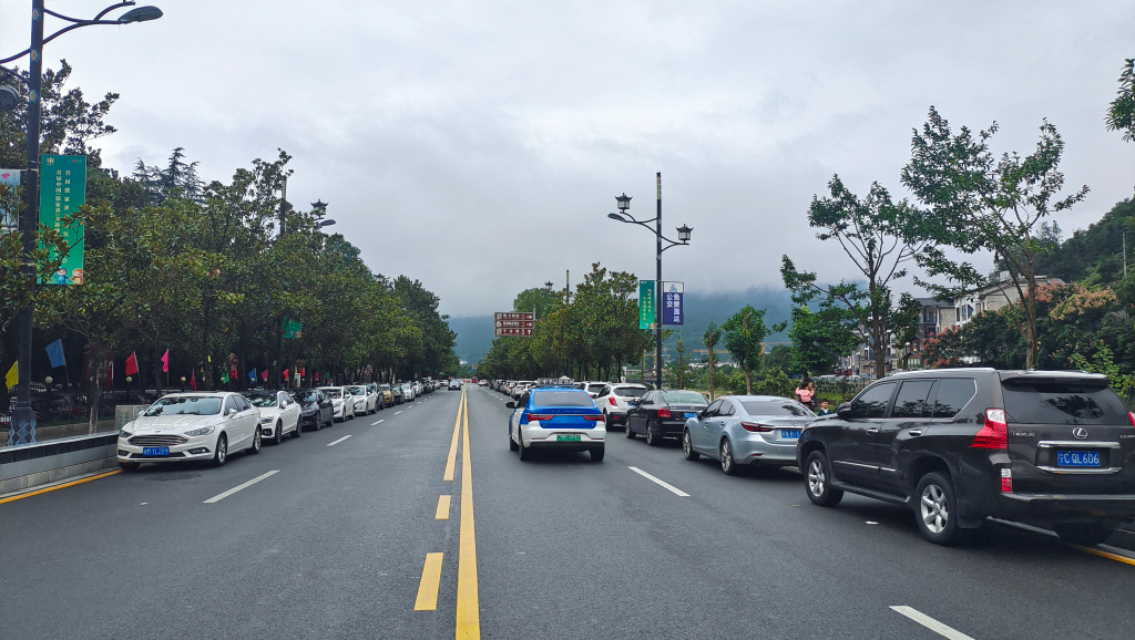 在不影响交通的前提下,车辆有序停放在武陵源城区道路旁边。(吴勇兵摄)
