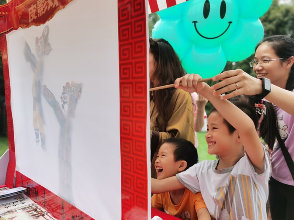 在上海桂林公园举办的“唐韵中秋”活动上,孩童体验皮影戏。 新华社记者 陈爱平 摄